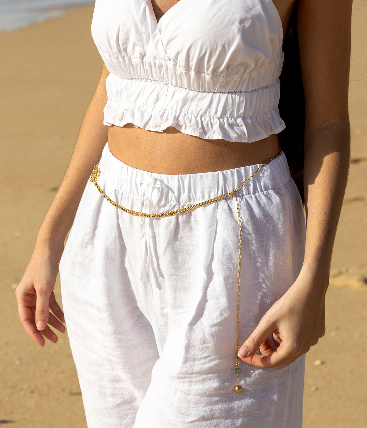 Waist jewel in golden steel. Ideal for accessorizing an outfit with elegance during summer, ceremonies, or evenings.
